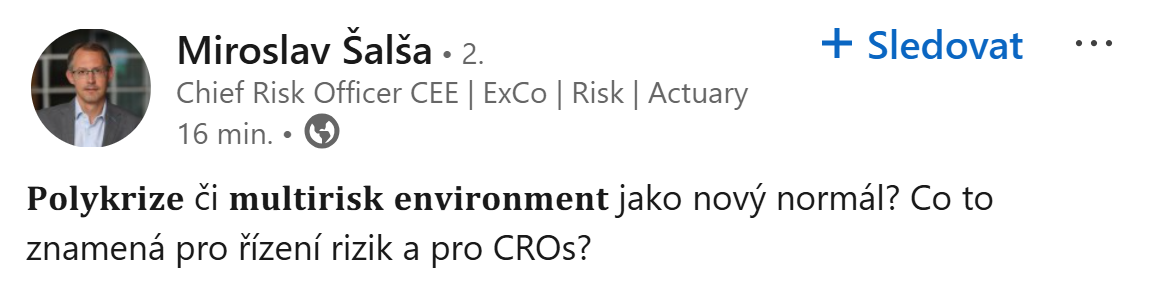 Letos jsem absolvoval manažerský vzdělávací cyklus ČBA Strategické řízení pokrývající spektrum témat od geopolitiky přes energetiku, budoucnost financí, životního prostředí až po témata související s kyberbezpečností, umělou inteligencí a kryptoměnami. Spolu s výstupy konferencí ČAP (Výroční konference pojistného trhu, War economy) a jiných je zřejmé, že i následující roky budou ve znamení zvýšené dynamiky a nejistoty ohledně vývoje vnějšího prostředí a rizik / hrozeb obecně.Na disciplínu řízení rizik jsou a budou kladeny zvýšené nároky, nicméně jednoznačně jde i o příležitost. Abychom tuto příležitost využili k navýšení přidané hodnoty pro naše společnosti i k posílení vlastní role, resp. role našeho oboru, identifikoval jsem si pro sebe 5 bodů, které považuji za důležité: