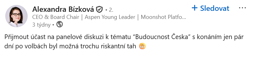 Přijmout účast na panelové diskuzi k tématu "Budoucnost Česka" s konáním jen pár dní po volbách byl možná trochu riskantní tah 🙃