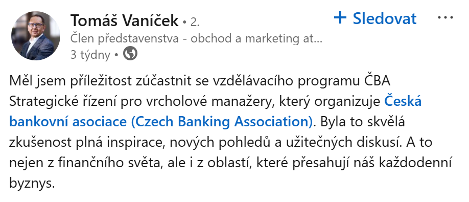 Měl jsem příležitost zúčastnit se vzdělávacího programu ČBA Strategické řízení pro vrcholové manažery, který organizuje Česká bankovní asociace (Czech Banking Association). Byla to skvělá zkušenost plná inspirace, nových pohledů a užitečných diskusí. A to nejen z finančního světa, ale i z oblastí, které přesahují náš každodenní byznys.Program se věnoval tématům z oblasti financí a strategického řízení, ale i dalším oblastem, které dnes formují celý svět – umělé inteligenci, kyberbezpečnosti, udržitelnosti či geopolitické situaci. Právě tyto aktuální výzvy považuji za klíčové pro rozšiřování obzorů a porozumění souvislostem, které ovlivňují náš byznys, ale i společnost jako celek.Velké díky patří organizátorům – hlavnímu garantu celého programu Miroslav Zámečník a Andrea Šindelová, která se postarala o zajímavou programovou část. Tomáš Salomon děkuji za velmi inspirativní prezentaci na téma Transformace byznysu a Česka. Skvělí byli ale všichni řečníci. Jsou to opravdoví odborníci na svém místě.
